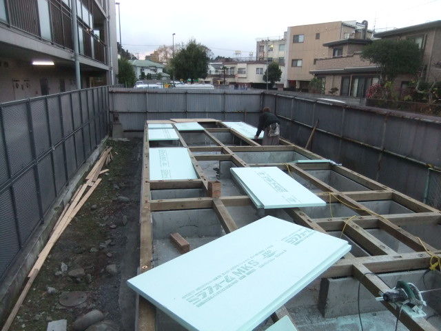 基礎パッキンを置いて土台を敷き、30mmのスタイルホームの断熱材を充填いたしました。