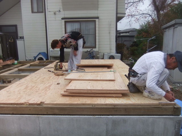 刻み工事が完了で、本日から、土台・大引き敷きとネタレス床下地貼りです。