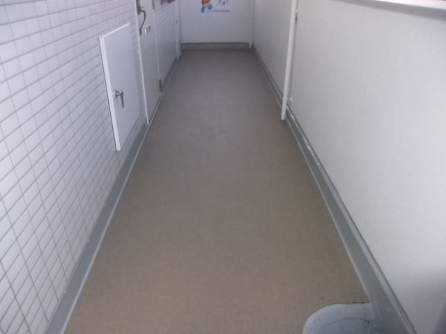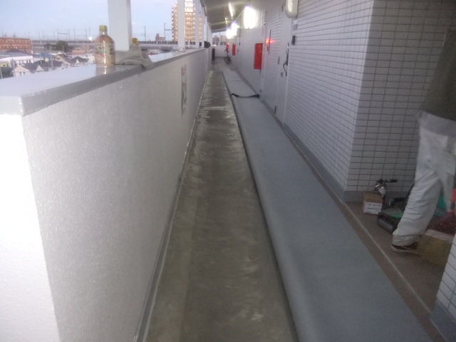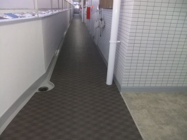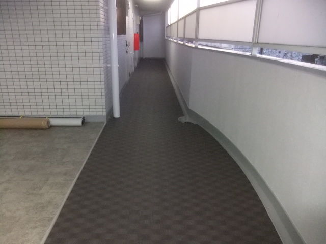 外部通路を修繕して長尺シートを貼って行きます。
