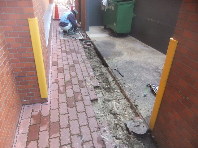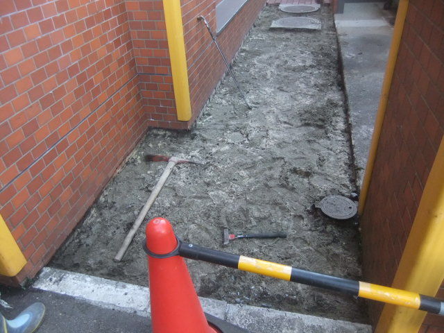 外部通路を通行止めでの、インターロッキングを撤去して、新たに雨水浸透枡を新設して雨水配管を切り回しでの滑り止めのコンクリートを打ちます。