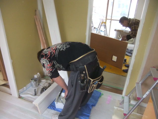 最後の造作工事と製作建具取付工事完了で内装クロス貼りでの完成になります。