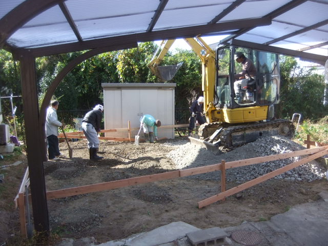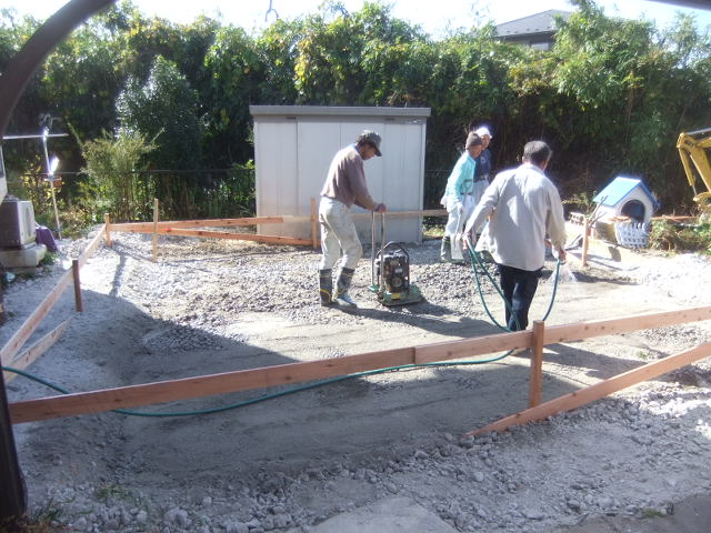 基礎工事で、増築部の丁張り工事から、掘削しての地ならしで砕石転圧から捨コンクリート打ちです。