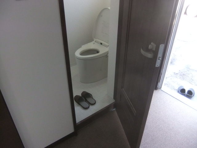 既設和式トイレも床のハツリ、入り口廻りの鉄筋コンクリートをハツッテの撤去で、天井・壁・床を組み直してシャワートイレ付きの洋式エコトイレを取付けました。