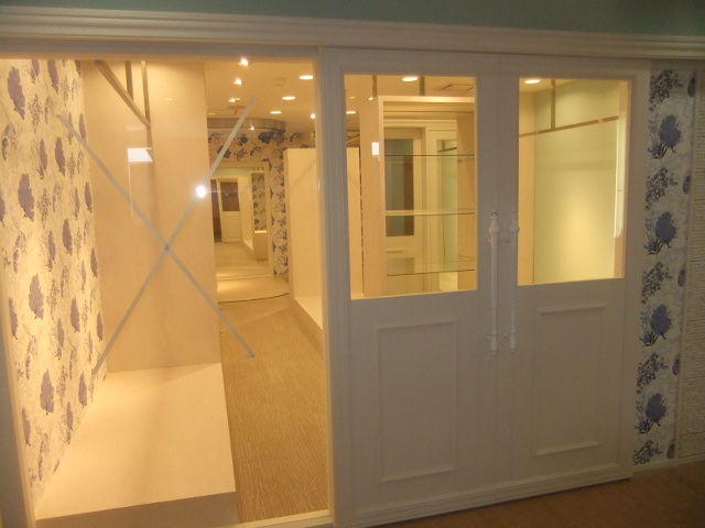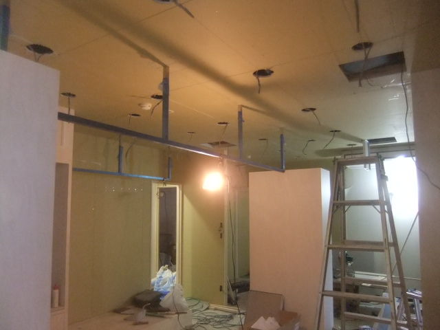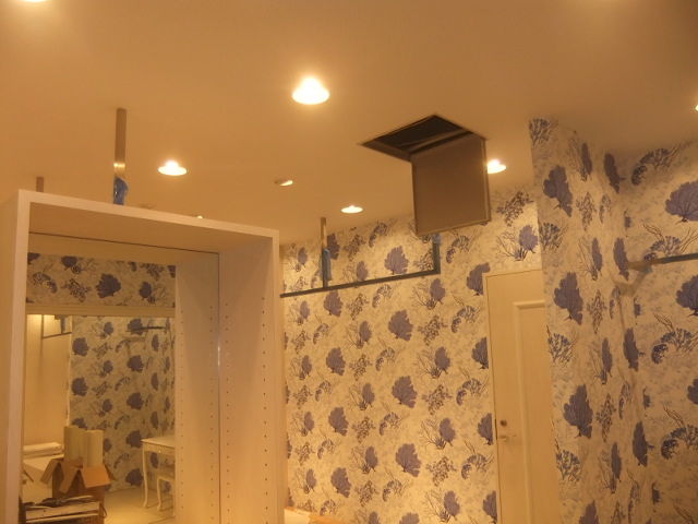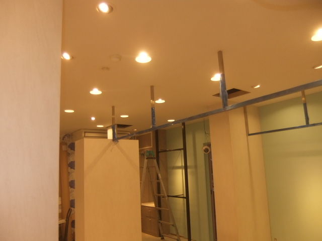 ドレスサロンでの夢の空間構築での全面天井・仕切り壁解体工事で、天井設置吊りステンレス角ハンガーパイプの貫通での取り付け下地補強とロイヤル支柱ハンガー天井ブラケット設置補強とダウンライト40ヶ所設置程の開口軽天移設での補強工事、完全オーダーでのドレスシェルフ設置での天井・壁下地補強、大型鏡設置、大型ガラス設置面の壁補強工事、完全オーダー制作での引き戸、開き戸、引き分け戸、片引き戸等のアウトセット設置部分の補強工事、大型換気扇設置廻りの天井下地補強工事、大型アールカーテンボックス天井設置での天井で補強工事等と見えない補強工事が予定工事内容では、部分補強工事対応と安易な見積りでしたが、開けて見ての想定外の天井レベルが悪過ぎるのと、天井2重貼りでの高さ確保での全面天井撤去での全面補強工事となりました。