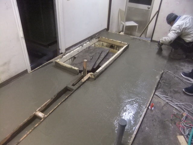 現実は、中華料理店での厨房器具等の交換ですと、重量での床が持たないとの事と、排水が対応出来ないので、全面厨房床解体での補強で、新たにコンクリート土間打ち工事でした。