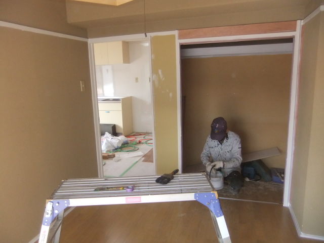 本日は、塗装職人とリフォームガッパ2人での静かな塗装工事とタイル工事で来週のクロス工事に繋げます。