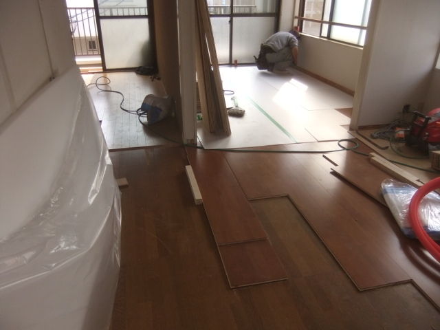 全面解体工事から和室改造での洋室化室改造リフォームと、給水・給湯配管の入れ替え工事とアンテナ・リモコンの配線での床開口に合わせて完全バリアフリーでの床フローリング貼り工事です。