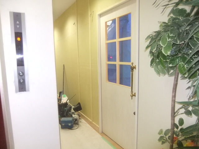共用部分の養生と部分通常営業の仕切り養生で、入口フロントドアの仮移設取付をいたしました。