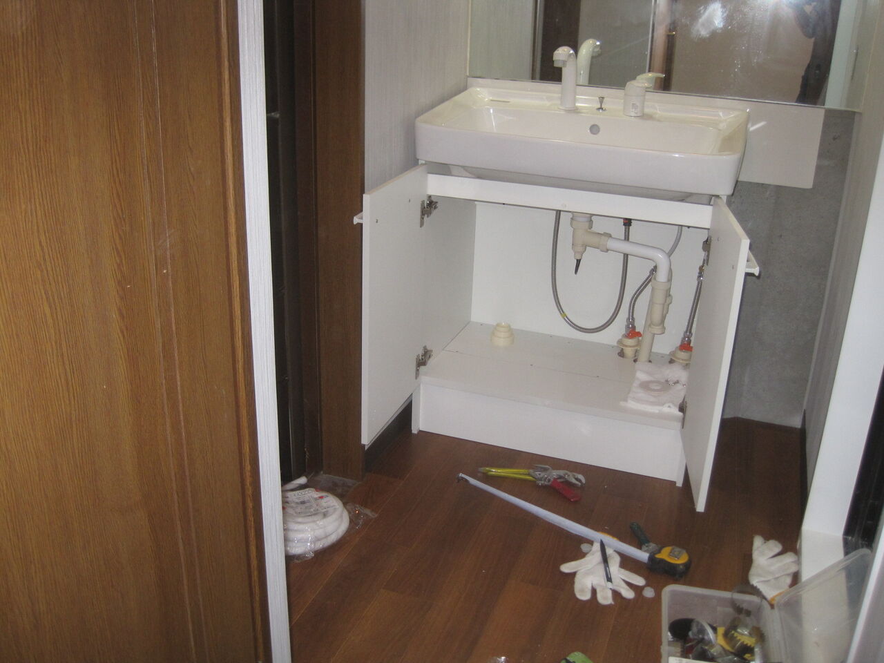 新たに配管移設での洗濯防水パンと洗面専用水栓を設置です。