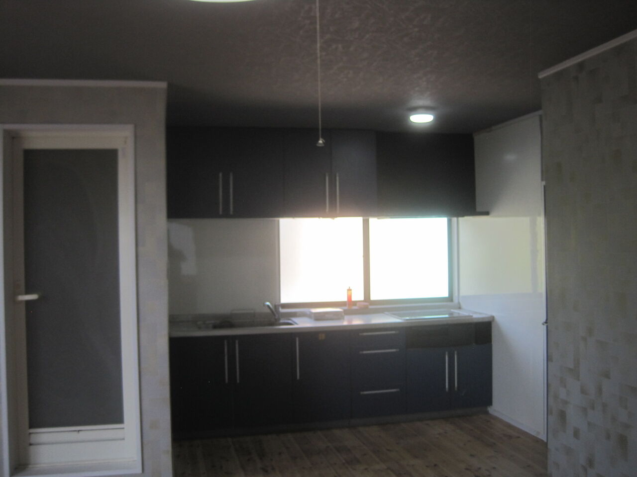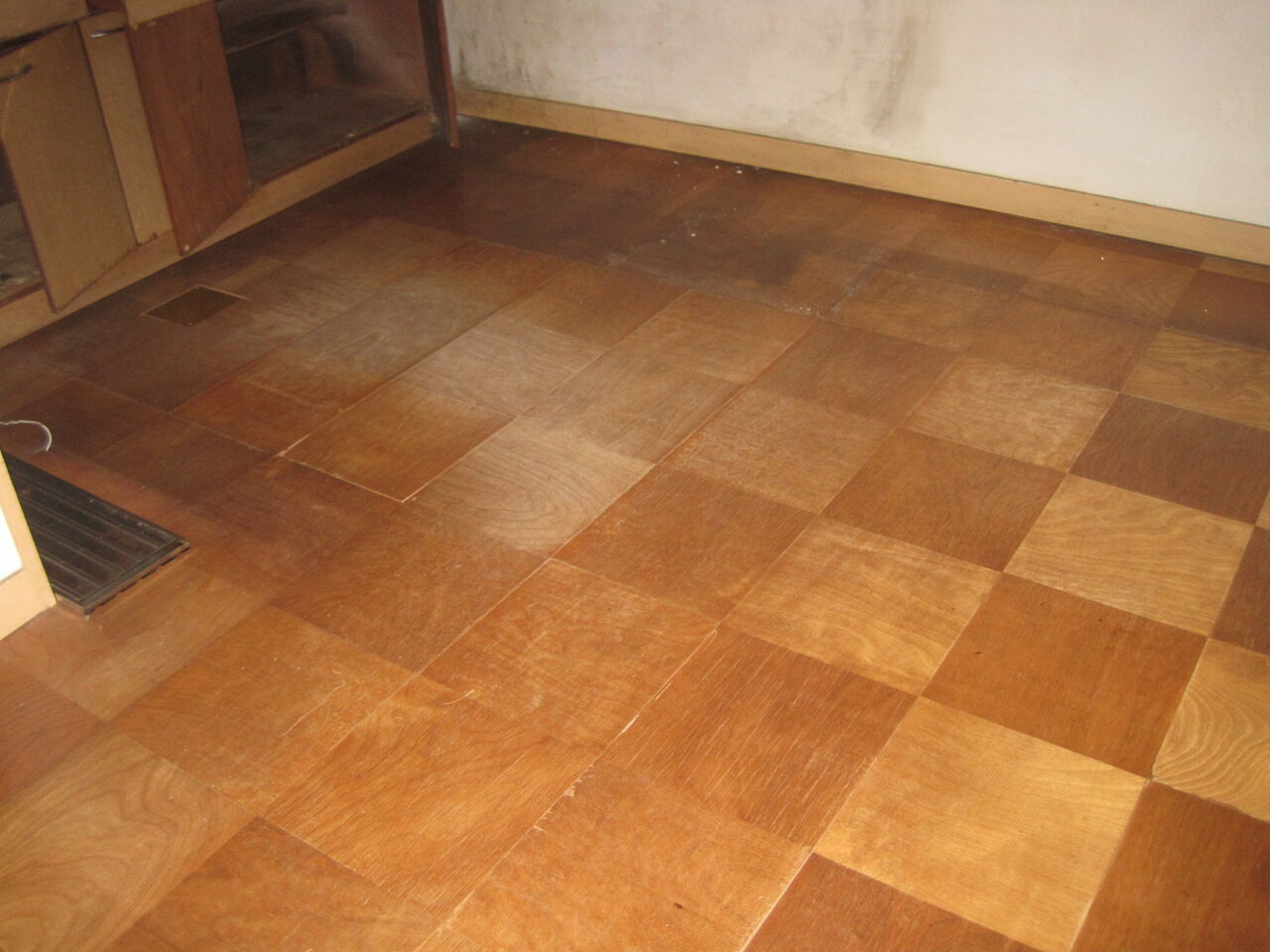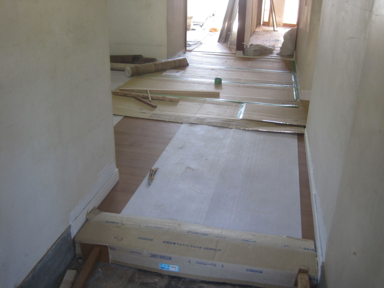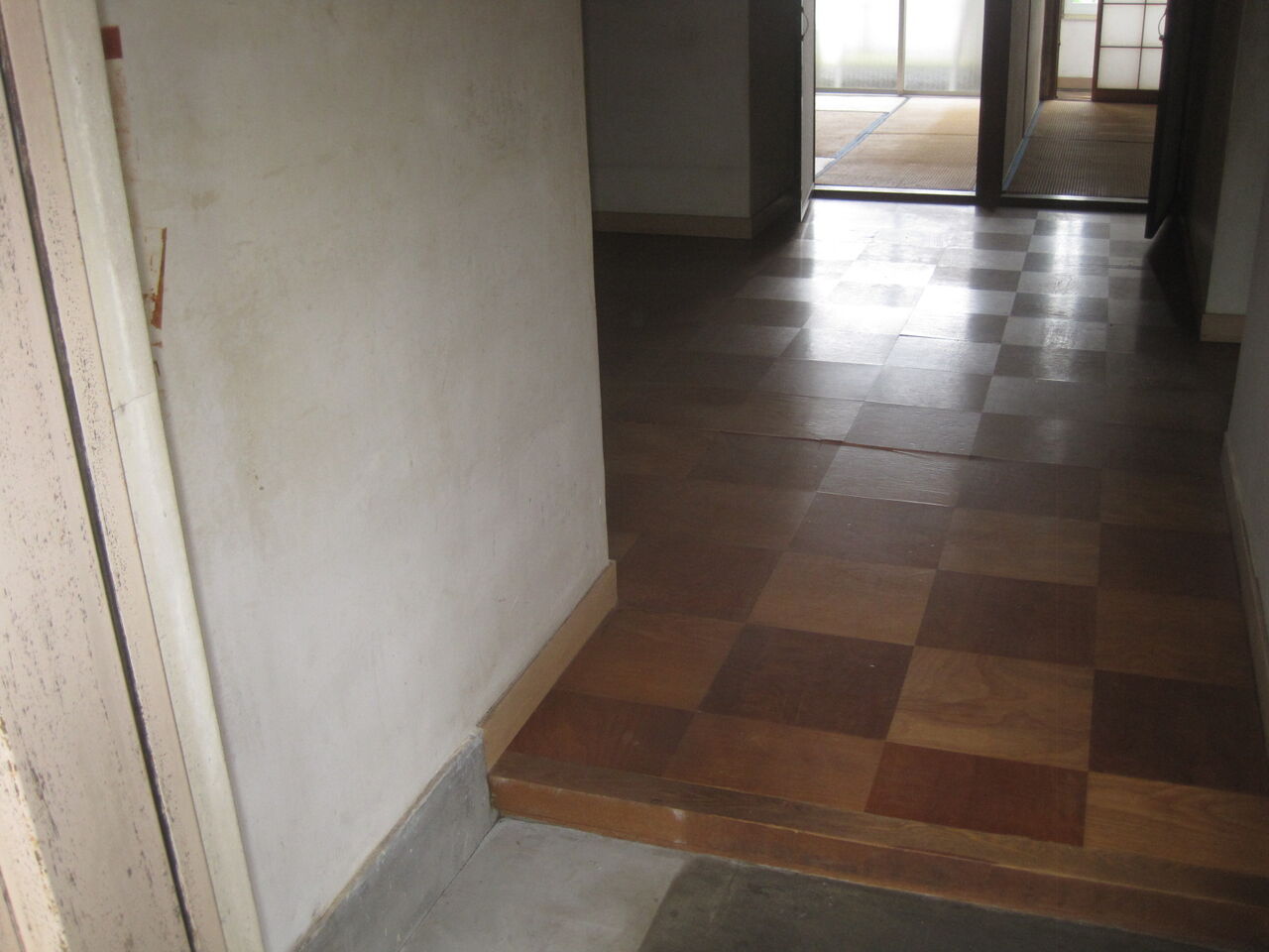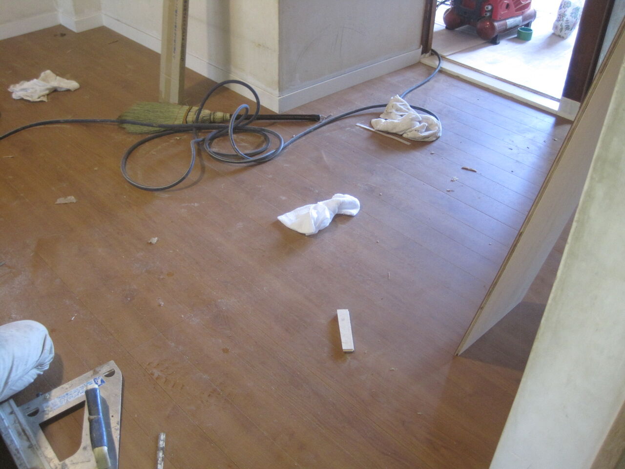 台所の床の浮、沈みをビスで絞めてから洗面所まで全面バリアフリーでのフローリング重ね貼りです。流し台・吊り戸、湯沸し器撤去でカビ除去剤等でのキッチンパネル貼り、洗面台内部、壁キッチンパネル貼り、照明シーリング交換からLED照明設置、玄関上り框設置、壁・天井はパテ・シーラー処理でのクロス貼りで干渉する木部際を塗装しておきます。和室入口2ヶ所をレバーハンドルドアに廻り枠設置で交換です。和室の繊維壁を全面斫って落としカビ除去剤塗布して、全面パテで天井・壁のクロス貼り前の干渉する木部際の塗装です。押入は天袋を塞いで天井も補強してハンガーパイプ設置で壁は石膏ボード貼でクロス貼りで、床は見切りを付けてフローリング貼です。仕切りはロールカーテンの取付です。縁側は床補強でフローリングを貼って、押入れは解体でフローリングを伸ばして、棚も見切りを付けてフローリングを貼りました。