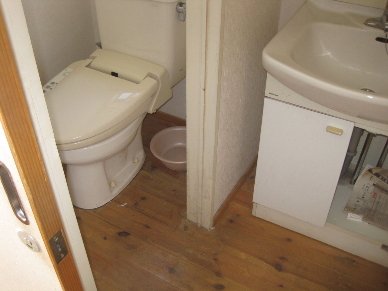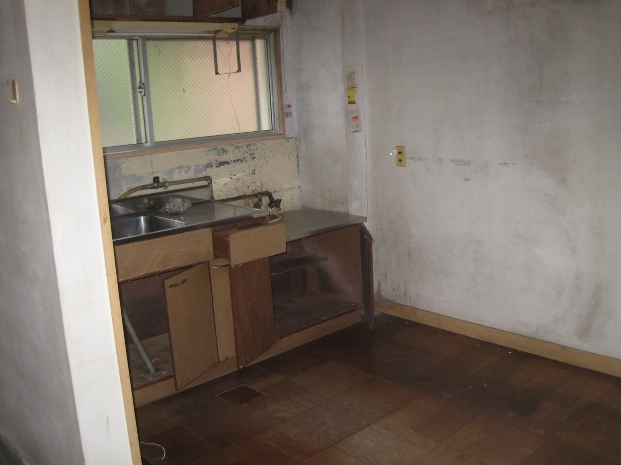 台所は床が沈み、流し台・吊り戸も破損で壁・ガス配管もカビと油で真っ黒です。壁はモルタルに塗装仕上げで天井は木目透かしで劣化状態です。洗面台も内部が腐食で亀裂状態で、壁も黒ずんでおります。トイレは床タイル、壁モルタルに亀裂で便座が割れ照明も破損です。浴室の入口廻りのモルタルヒビと内部のタイルも破損で照明はカバーが破損です。和室6畳2部屋は壁が繊維壁でカビで真っ黒で部分崩落です。押入れは襖が破損で壁ベニアもカビで浮いております。床は老けてぶよぶよです。天井は木目透かしで腐食で黒ずんでおります。入口扉襖も破損しております。縁側は床が沈み押入れも漏水でカビと腐食で真っ黒です。照明も破損で取付シーリングも破損しております。網戸も破損、玄関ドアも塗装が剥げてドアクローザーも破損で、コンセント、スイッチ、アンテナ端子も破損しております。