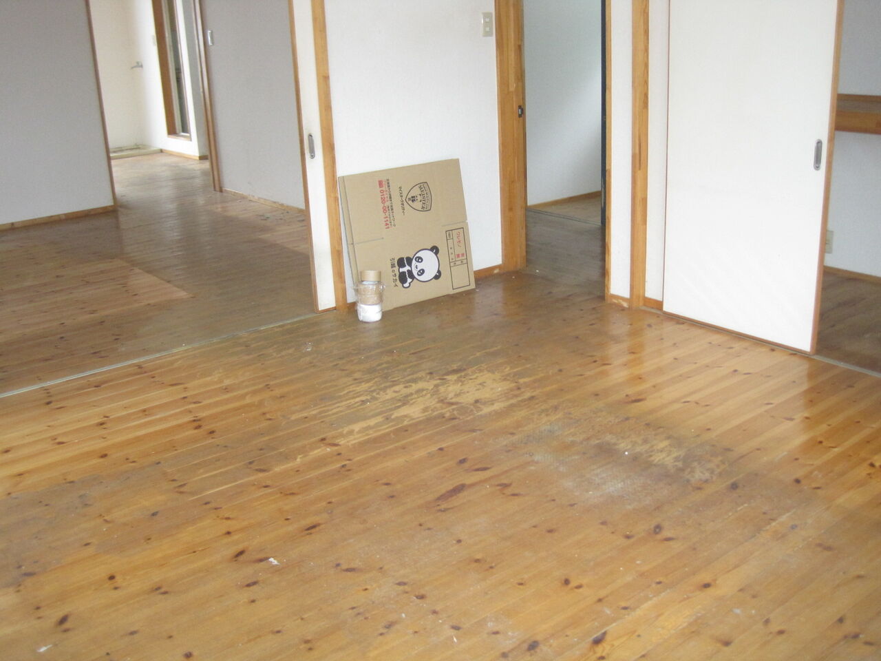 床の無垢フローリングの変色、劣化、ササクレは電動マルチサンダーで全面削ってから細かいやすりで下地調整でのウレタン塗装仕上げです。