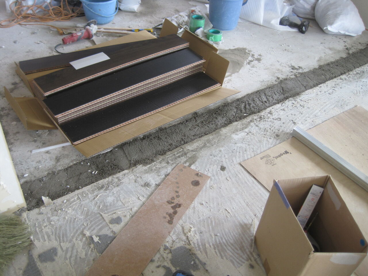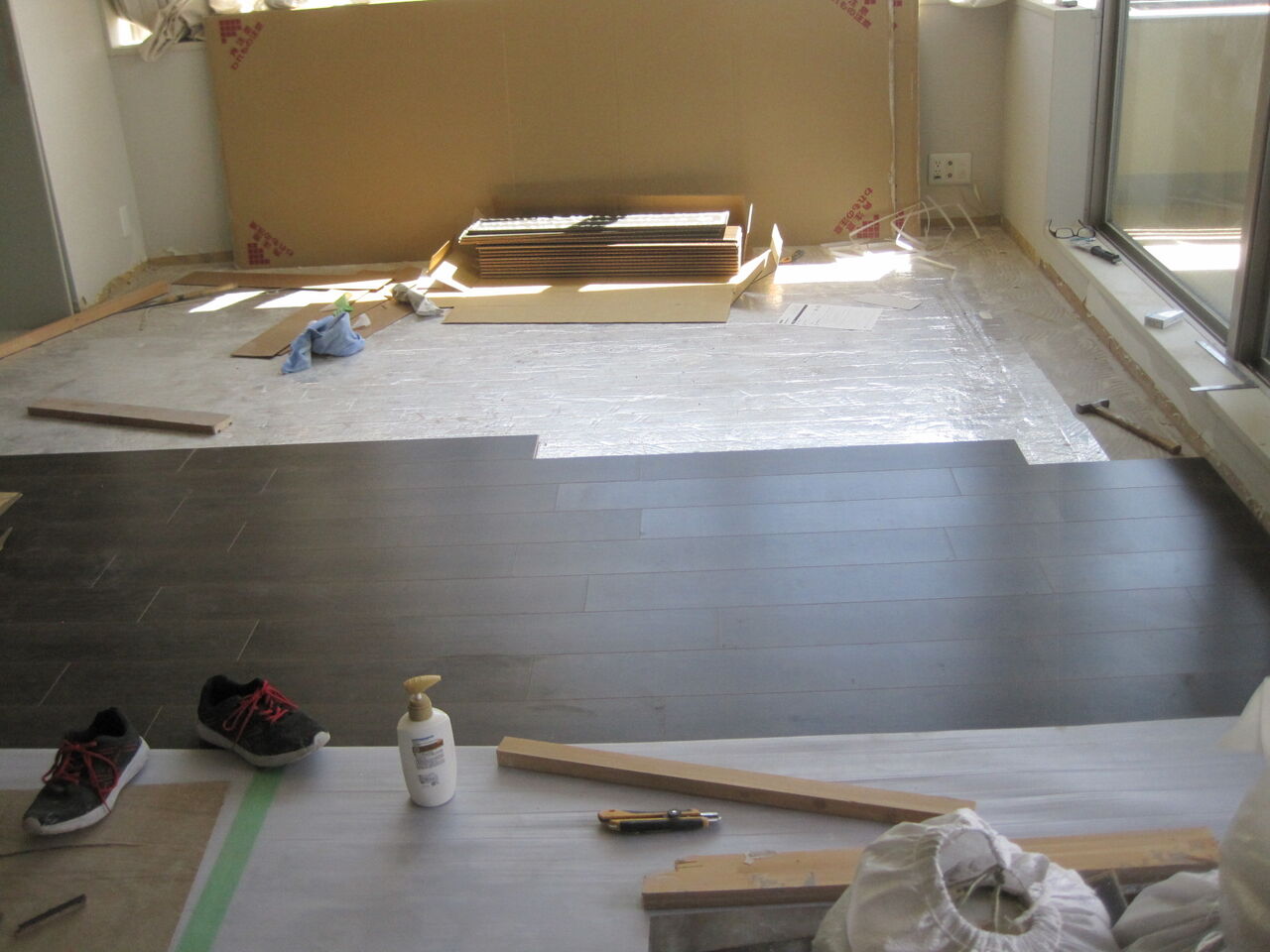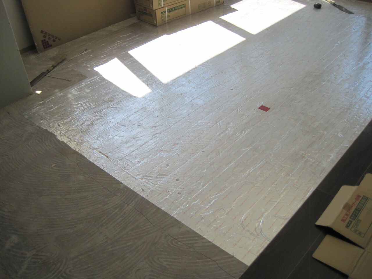 新たに床暖仕様の防音直貼りフローリングを貼って行きました。