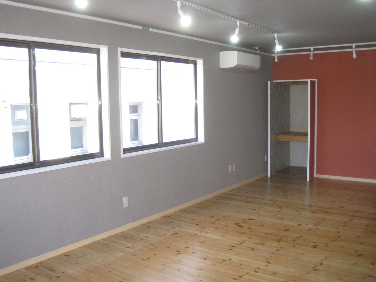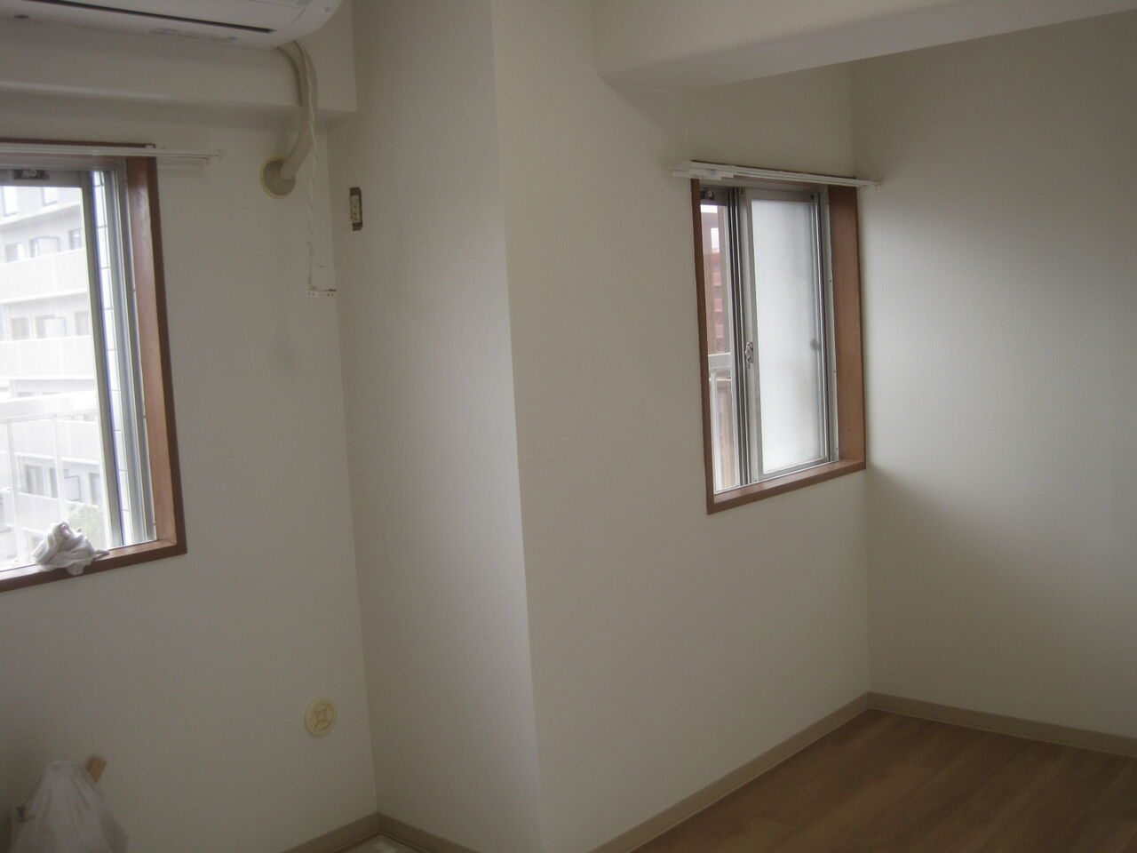 2部屋を仕切り壁撤去で天吊りカセットエアコンを撤去で新たに壁エアコン新設と天井修繕、壁修繕でクロスの貼替です。