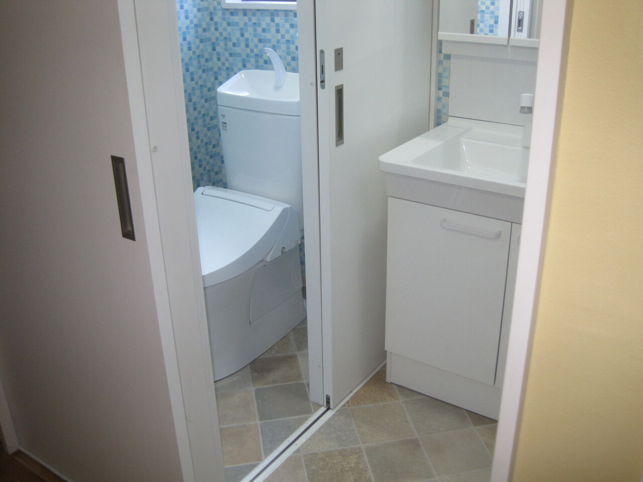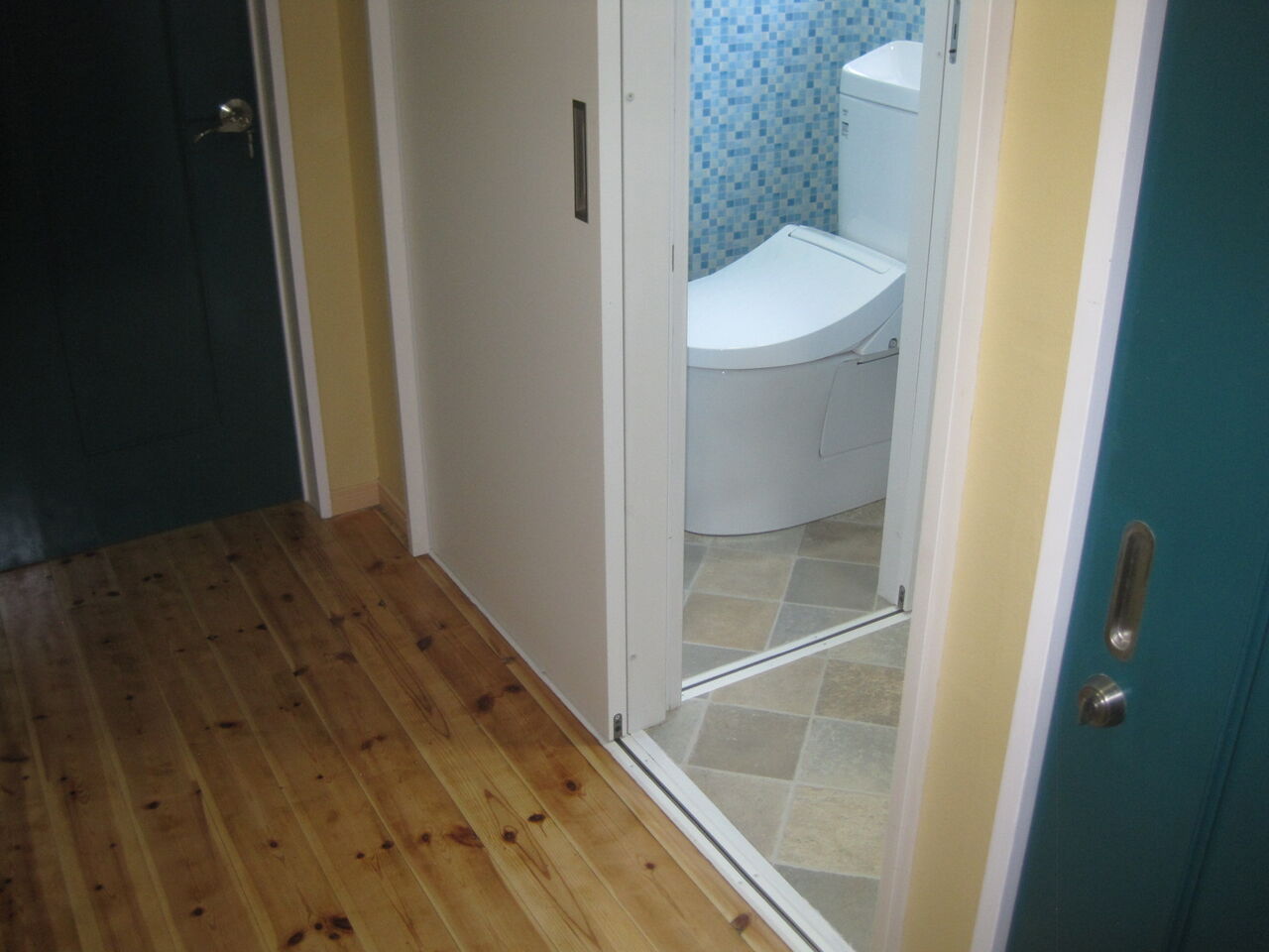トイレ・洗面所は段差があったので、完全バリアフリーでのドアも高機能の引戸に改造いたしました。