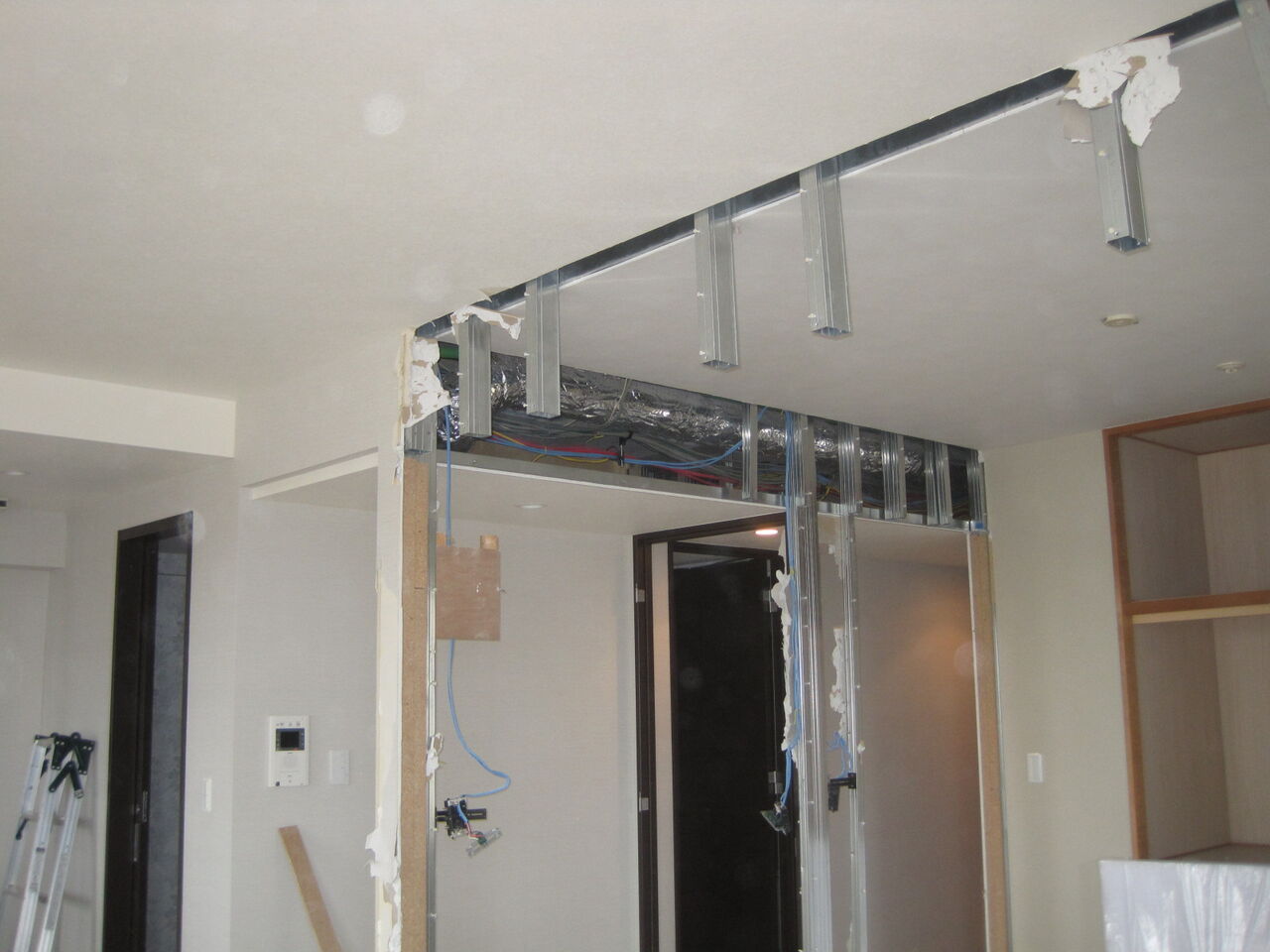 同じく天吊りカセットエアコンを撤去で新たに壁エアコン新設と天井修繕、壁修繕でクロスの貼替です。