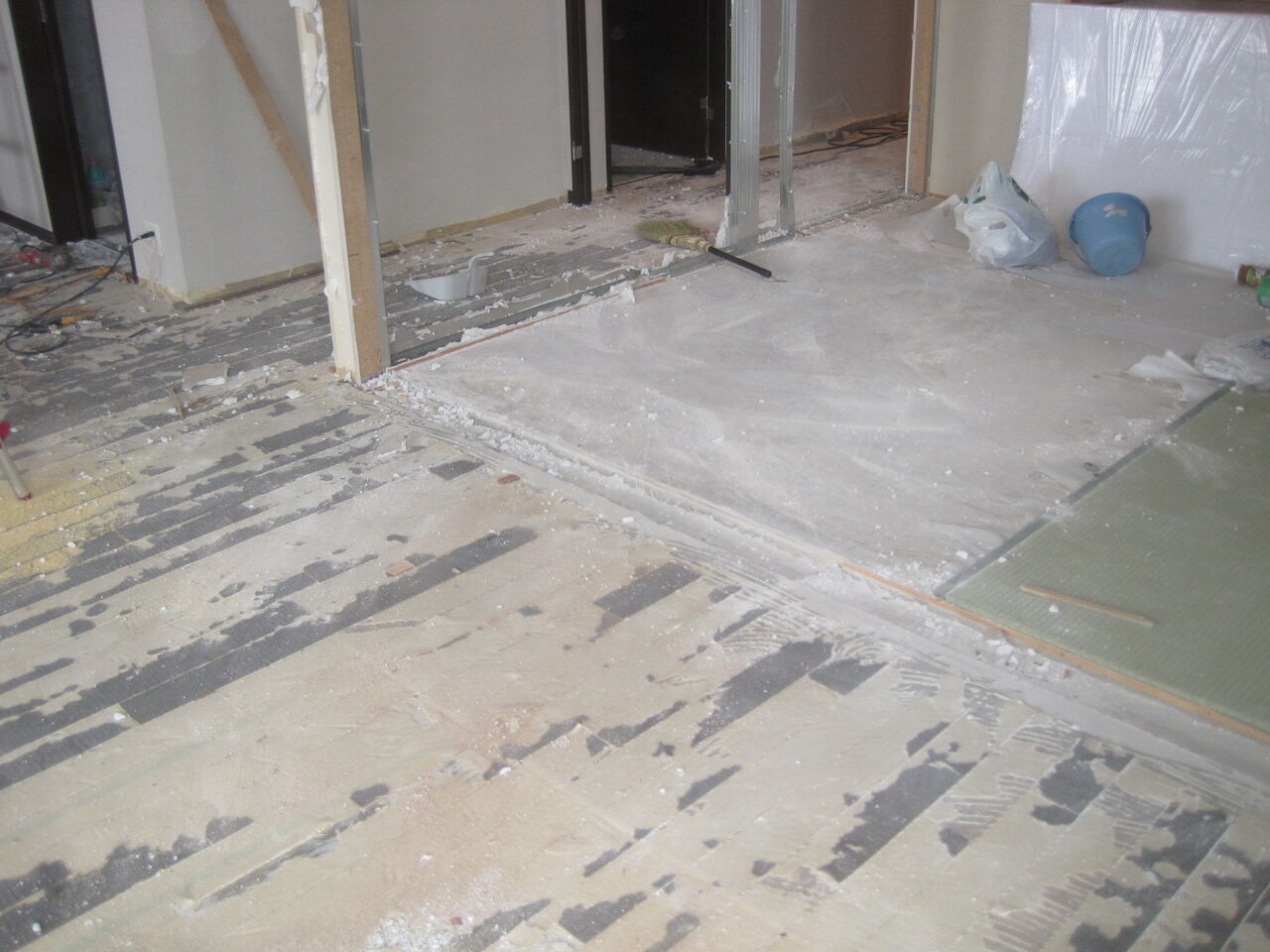 原状の防音フローリングの貼替です。既存フローリングを剥がしてから電動ケレン機でクッション材までスクレーバーで下地を調整いたします。