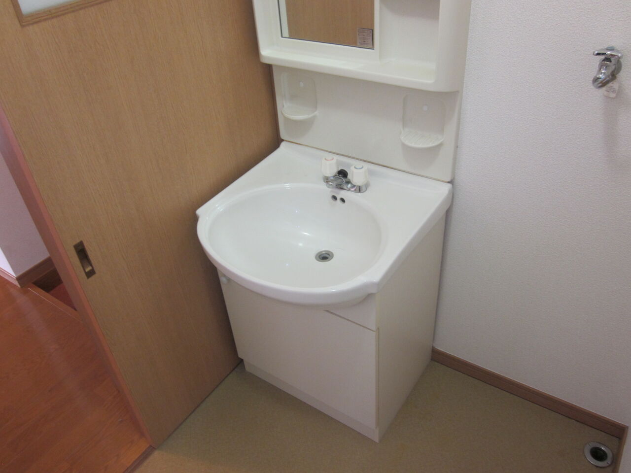 内装クロス貼替工事、和室をフローリングでの洋室化フローリング工事前にリフォームガッパがシャワーシングル水栓の洗面化粧台への交換リフォームと浴室のデッキ水栓を2バルブからサーモ付きのシングルシャワー水栓の交換リフォームをいたしました。
