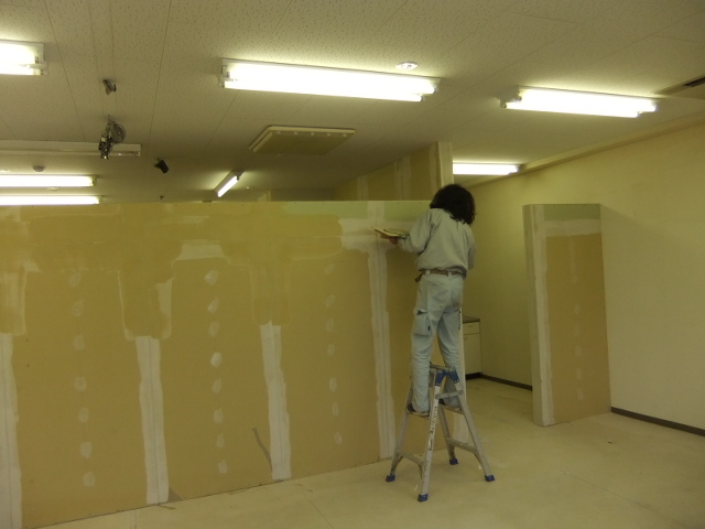玄関ブース、応接ブース、倉庫ブース、キッチンブース、スタッフ事務ブース、作業ブースと仕切り壁の造作が完了いたしました。