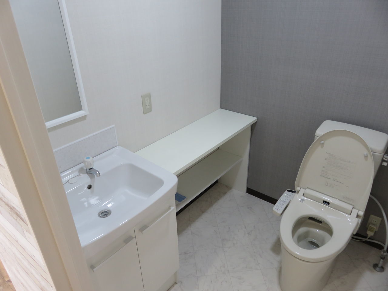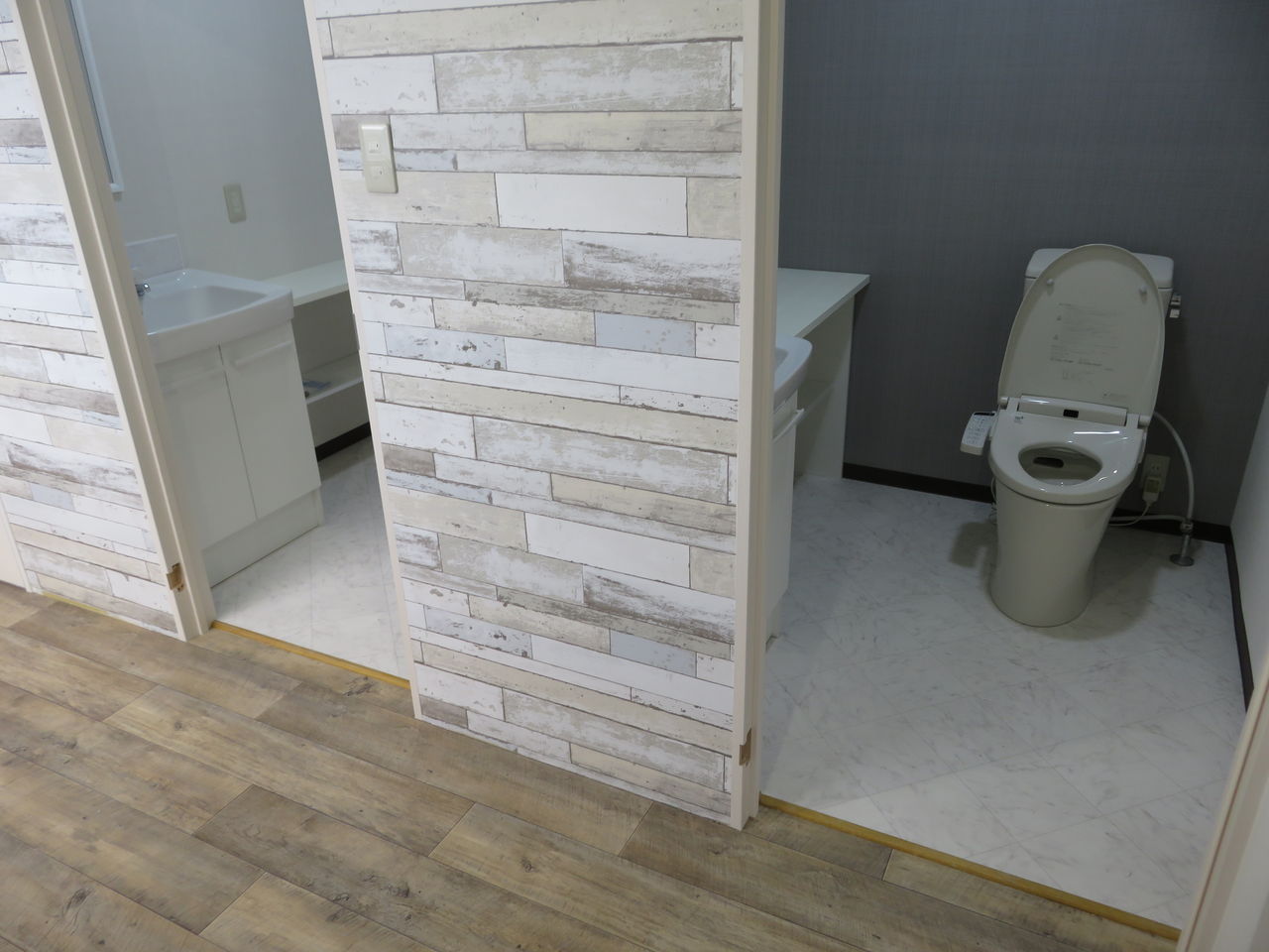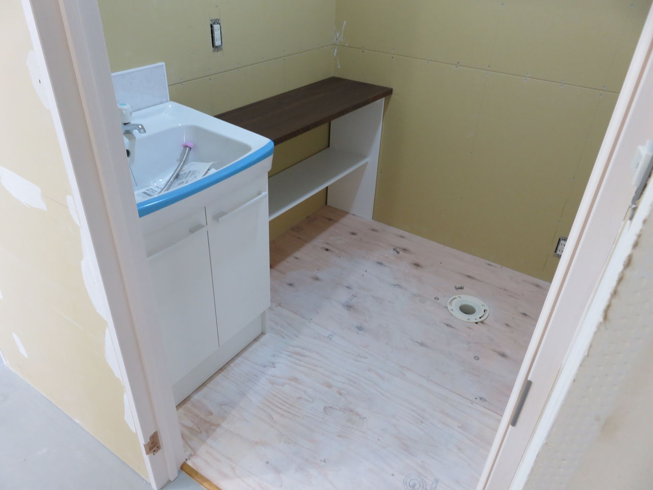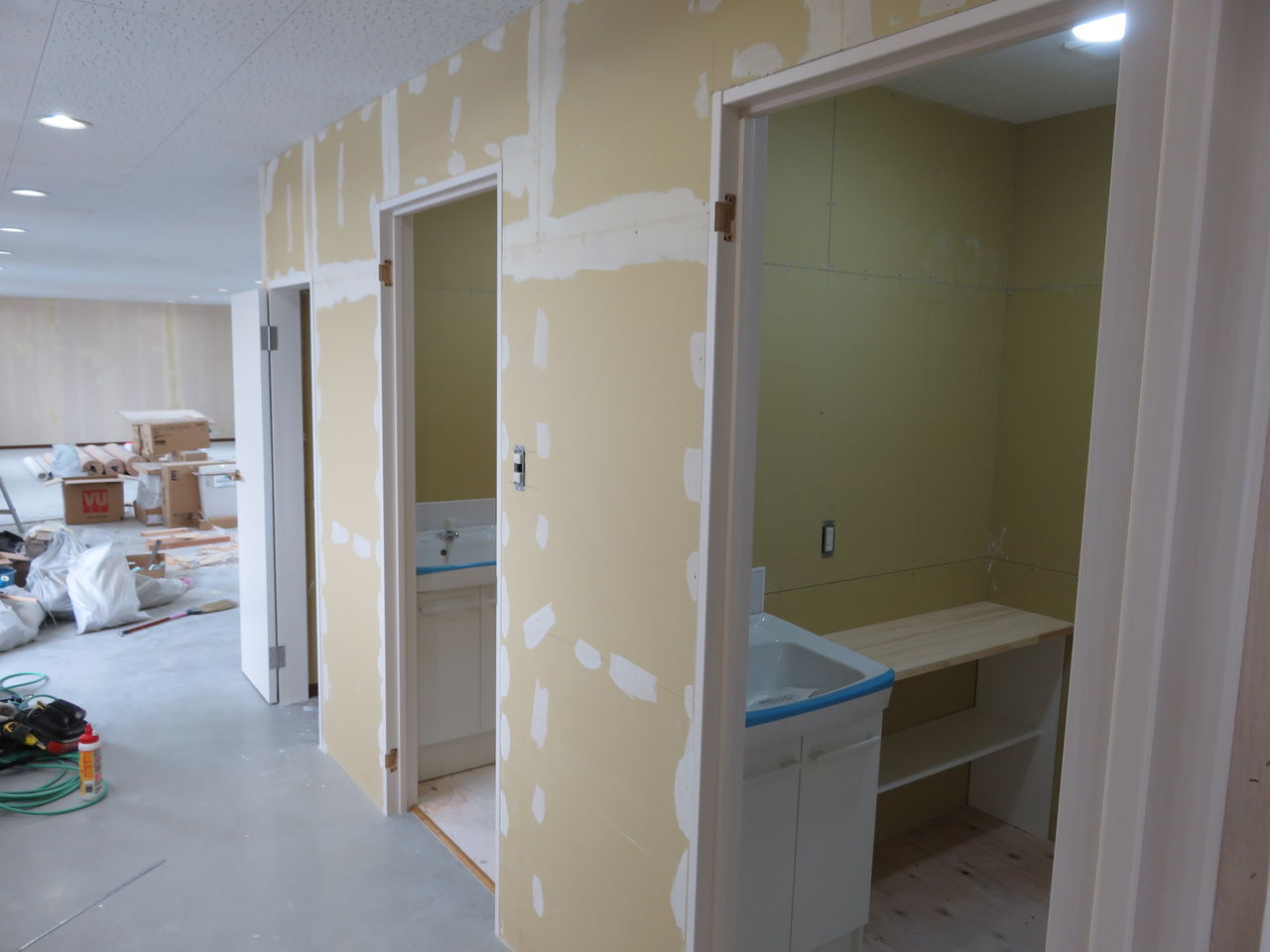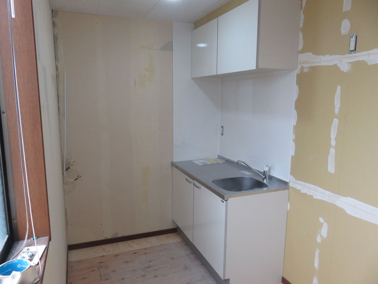 水廻りのトイレ、キッチンの新設での総務・営業室の内装クロス、床は店舗用のクッションフロアー貼り工事が完了で、トイレ、洗面、キッチンの取付設備工事も完成いたしました。