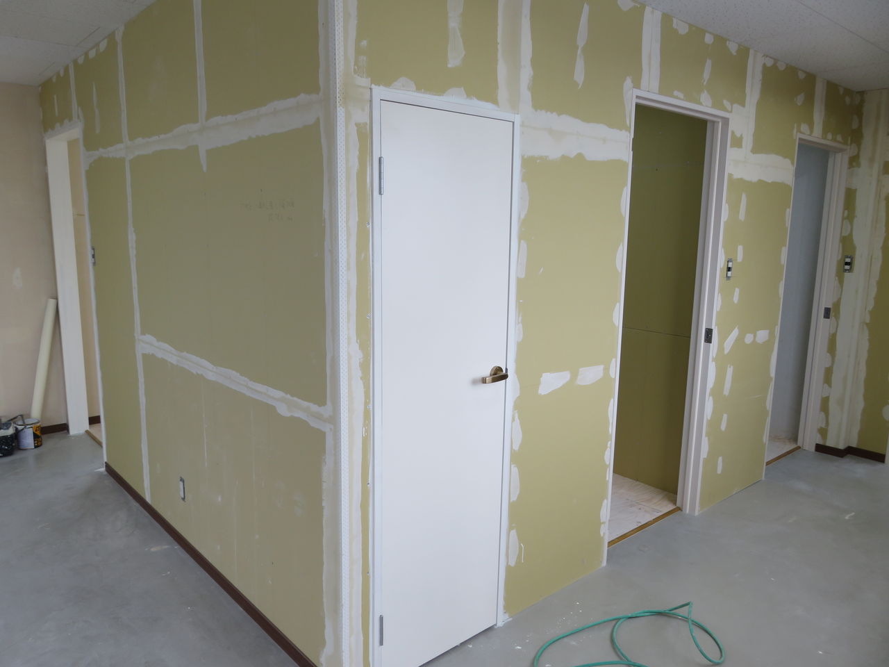 石膏ボードを貼り、入口枠下地を取り付けて内装クロス貼りの下地パテ処理となります。