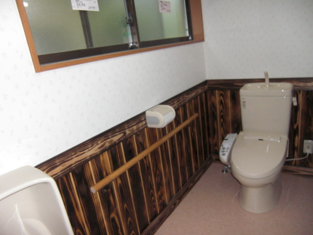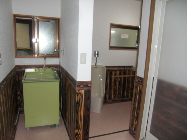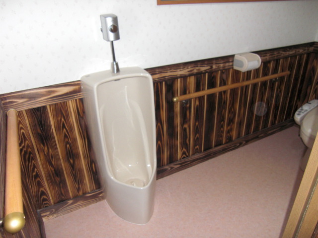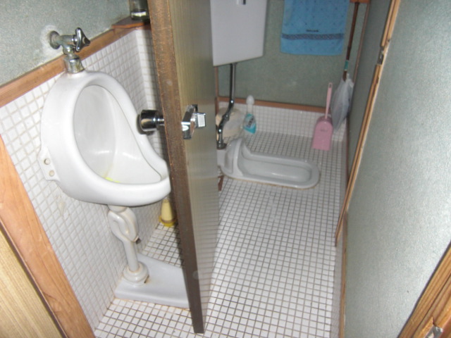 お客様のトイレは、狭い空間に小便器と和式トイレがありますので、車イスも当然入るスペースがありません。