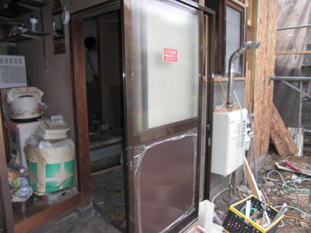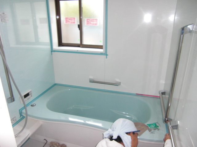 ユニットバスの組み立ても終わり、コーキング処理工事、腰壁工事、増築外壁工事、給湯器取り付け給水・給湯設備工事等で一気に波に乗っております。