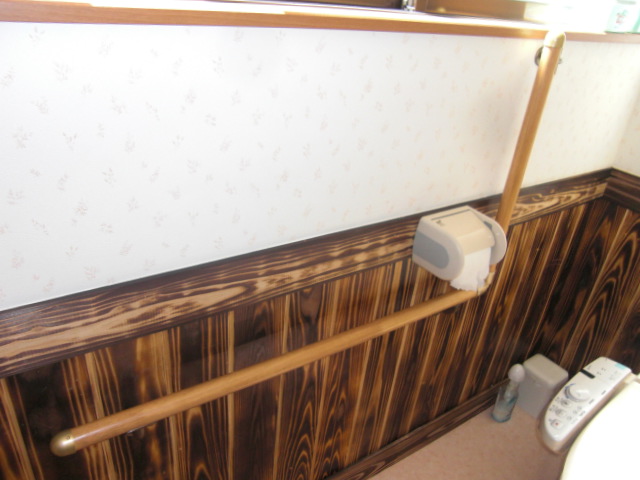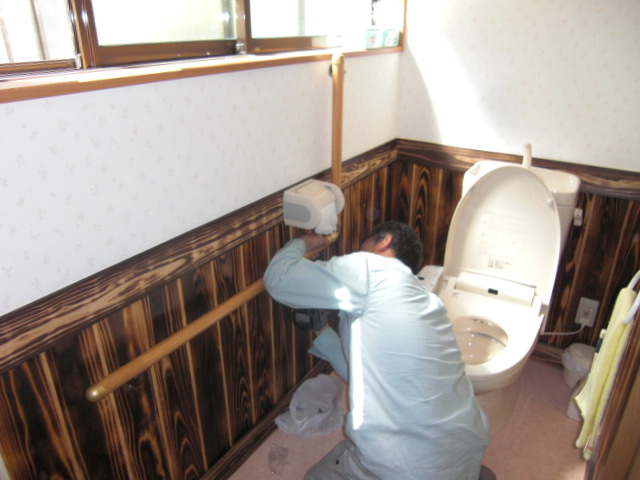 お客様に、実際に利用してもらい、微妙な手すり・紙巻きの位置を、ゆっくり、ゆっくりと確認いただきまして、少しでも使いやすい位置に移動です。