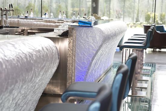 「装飾アクリル/アイス」が創り出したバーカウンターは、アクリルパネルがまるで本物の氷のような美しい表情と質感をアクリルに表現し、アイスバーにいるような感覚をお客様に与えています。