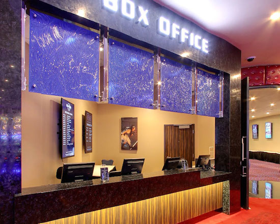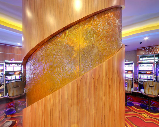 こちらも、フリーフォーム「ウィロー」に、ジェムストーン「コニャック」と「コバルトブルー」を施しカジノ内の壁面や柱、受付に使用。