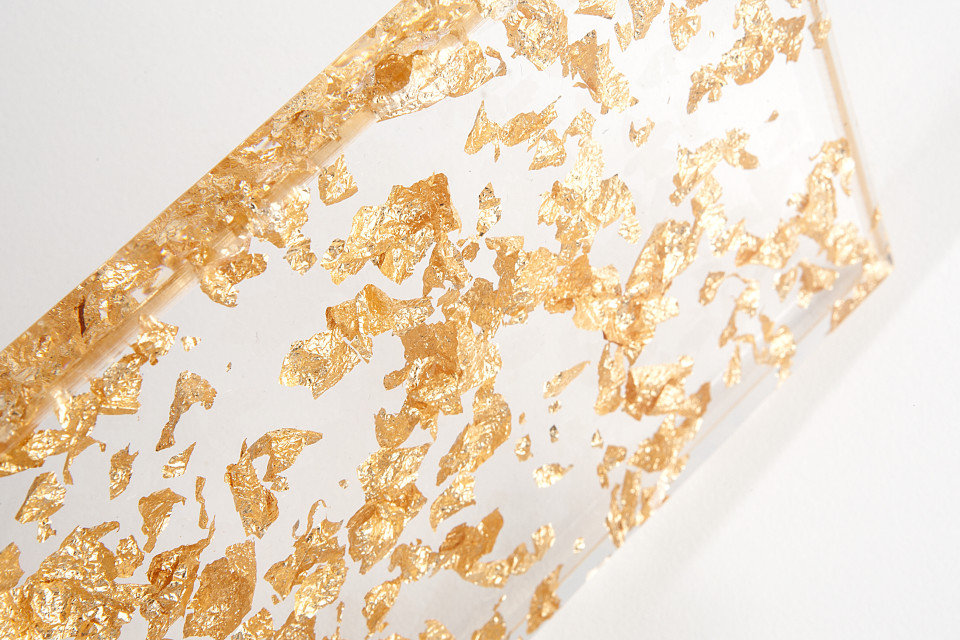 「Fiocchi」は、メタルフレークがアクリルパネルの中で踊り浮かんでいるようなデザイン。