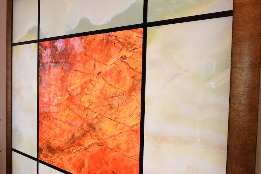 さまざまな用途として使用できる「装飾アクリルパネル」ですが、背面、上下などから照明ライトの光をあてて施工すると、よりその美しい装飾柄・表情がより際立ち、空間を美しく演出してくれます。