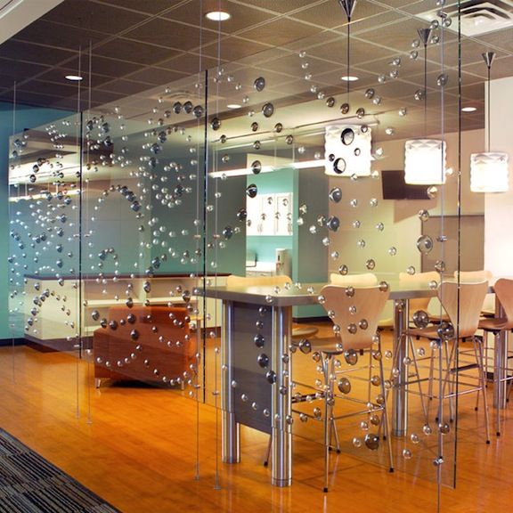 その中でも、水玉模様や、ティアドロップ、サークルなどの3Dデザインが、ガラス表面に施された「スフィア」は、優れたデザイン性を誇り、パーテーション・ウォール・カウンター、店舗やパブリックスペースなどの空間を演出します。