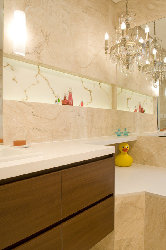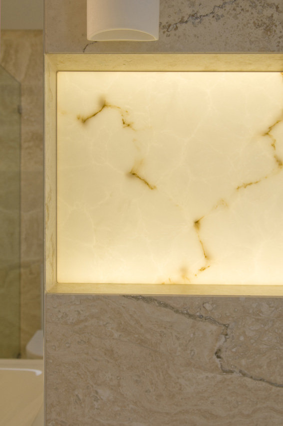 デコレーションストーン・パネルの美しい表情が、同じく壁面に施工されたタイルとエレガントに調和し、空間全体を華やかに演出しています。