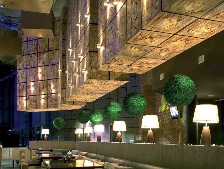 デザイン性の高い装飾柄で、カウンターやテーブルトップ、天井、壁面や照明器具などの家具デザインなど、あらゆる用途に使用でき店舗やパブリックスペースを演出する「装飾アクリルパネル」。