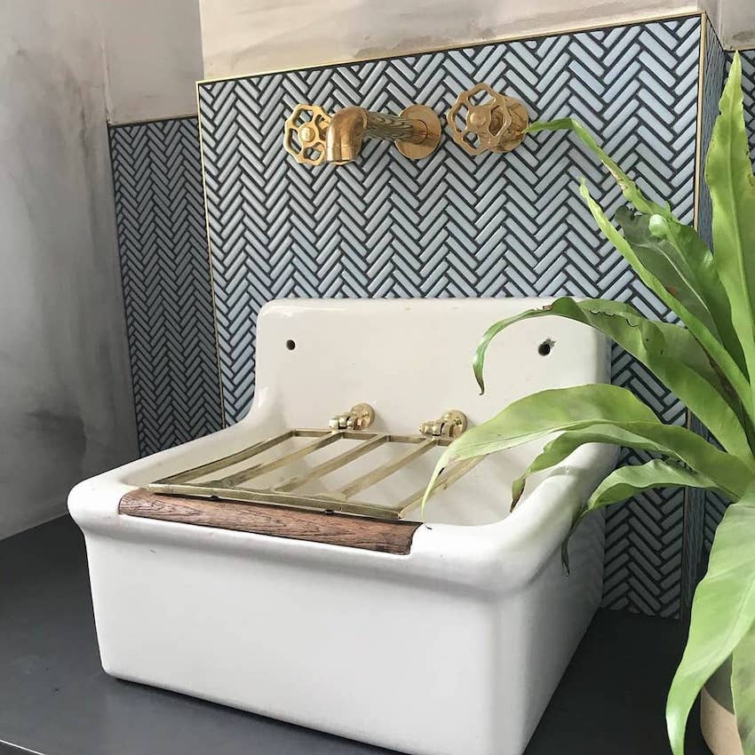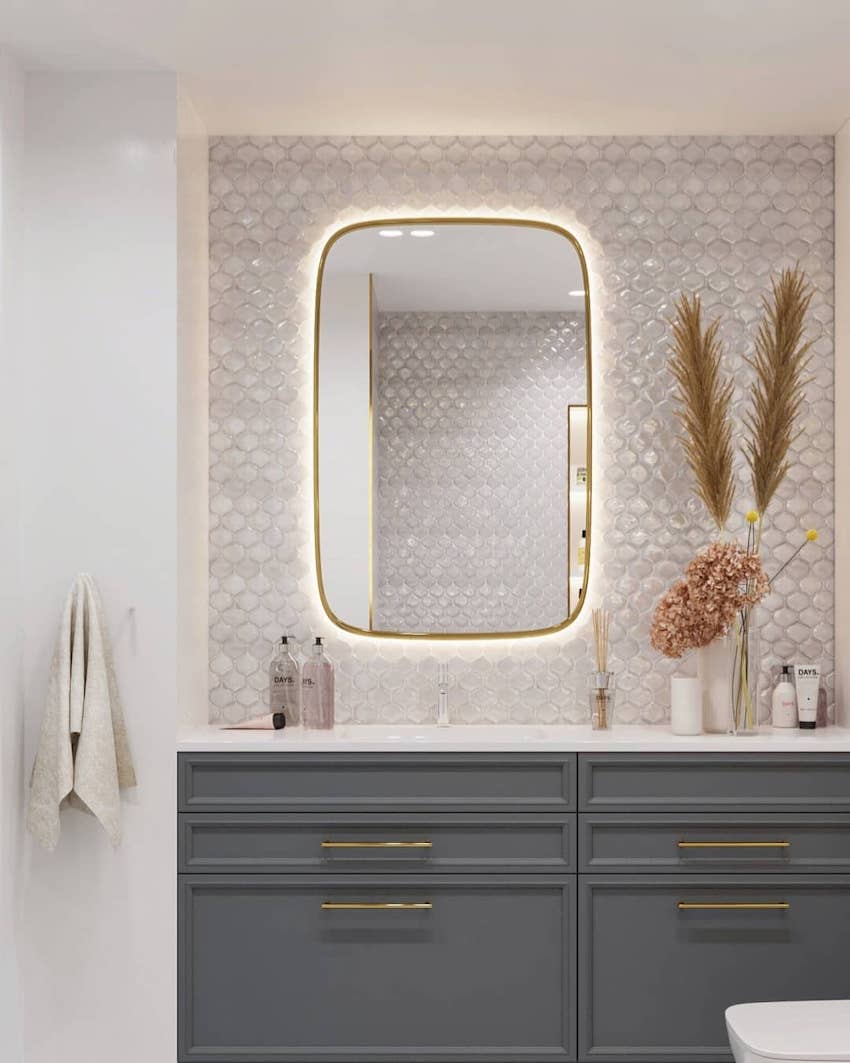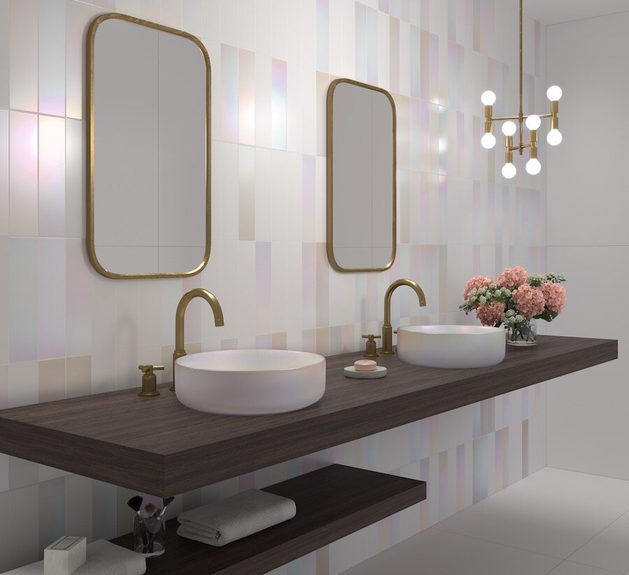 レージェンシーでは、さまざまなタイプの「装飾タイル」をご用意しておりますが、今回はメタリックの扇型タイルデザインで、タイル表面に凹凸感を表現したデザインの装飾タイルモザイク「Sirena Gold」を洗面壁面装飾として使用した事例をご紹介したいと思います。