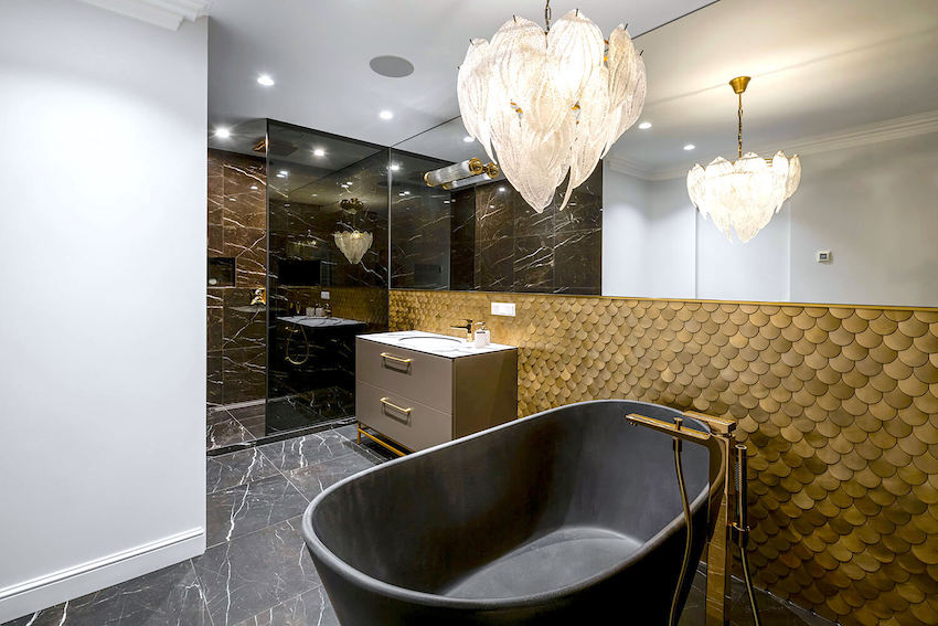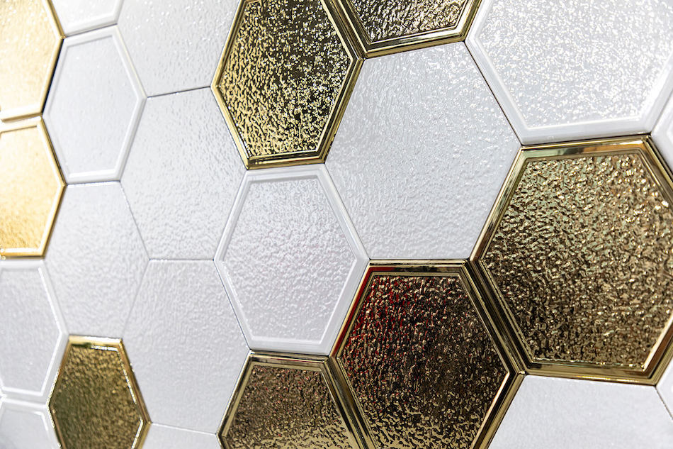 装飾タイル「Shapes」の凹凸あるデザインが照明ライトの光を受け、空間に華やかさとアクセントを加えながら、ゴールドの色味を相まって空間をエレガントに演出しています。