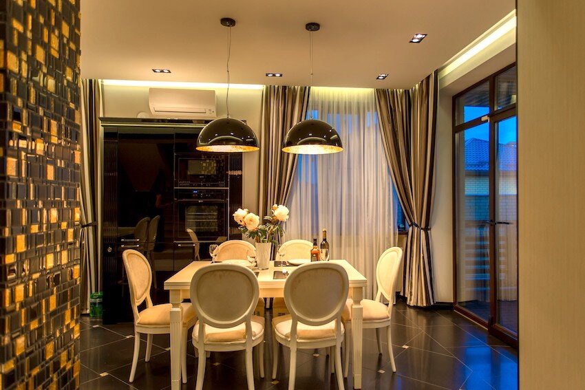 装飾タイル「Shapes」の凹凸あるデザインが照明ライトの光を受け、空間に華やかさとアクセントを加えながら、Whiteカラーがゴールドの色味を相まって、空間をエレガントに演出しています。