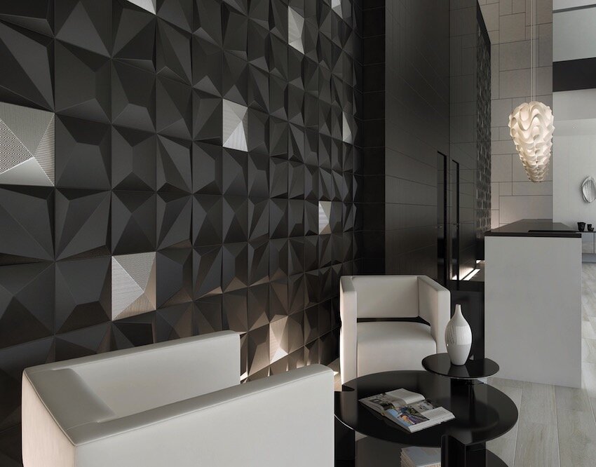 装飾タイルのラインナップのなかでも、タイルの3D形状が立体感ある独創的・意匠性の高い空間を演出し、ホテルやレストラン・店舗はもちろん、ご自宅のなどあらゆる空間の壁面を華やかでラグジュアリーな空間へと創造してくれます。