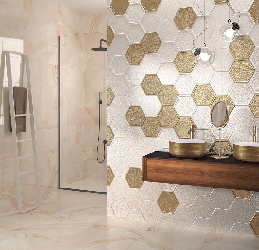 今回、装飾タイル「Majestic」の「Decor Nacar」と「Decor Gold」が使用されています。