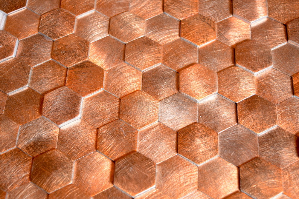 装飾モザイクタイル「Corten」は、小さな六角形からなるメタリック素材の装飾タイルです。
