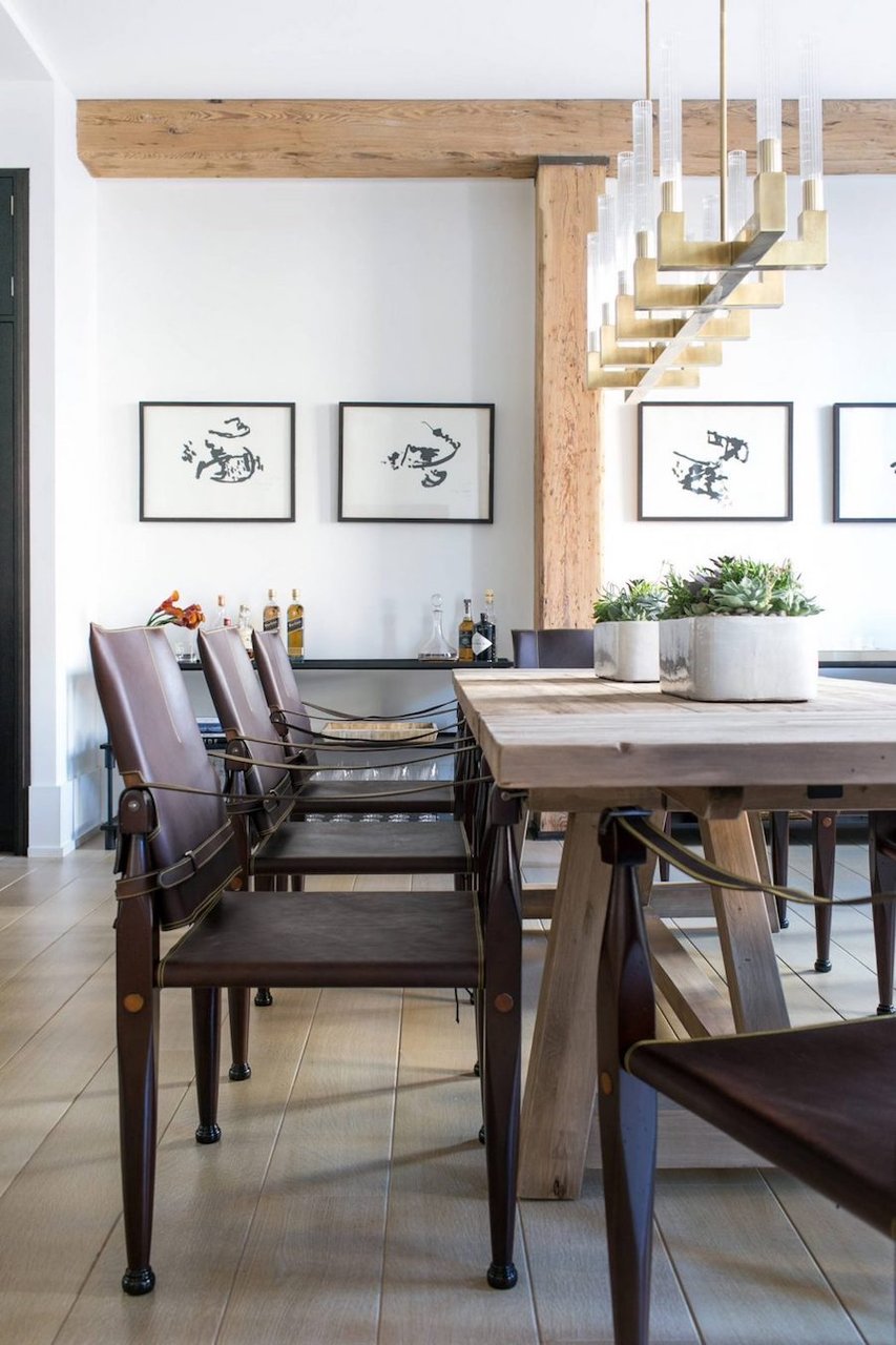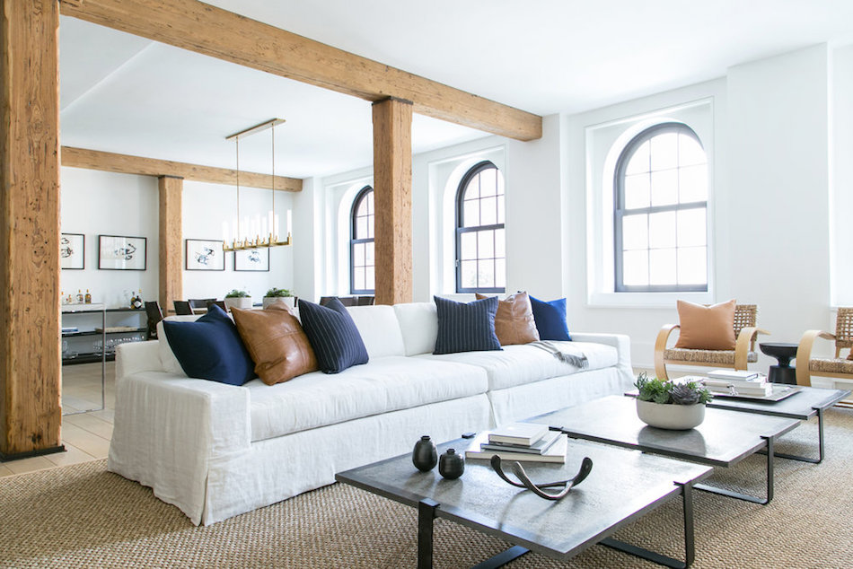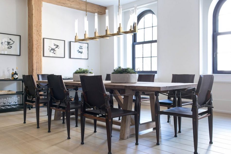 白とウッドの色を基調としたエレガントな空間に、レストレーションハードウェアの照明「Clemson Prismatic Single Pendant」が、空間に落ち着きと爽やかさを演出しています。