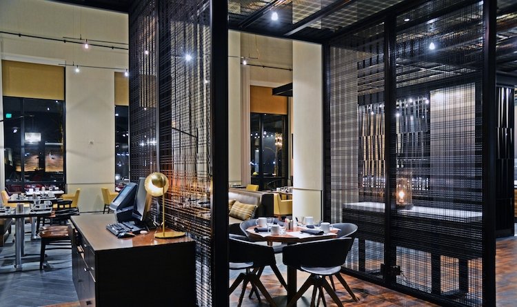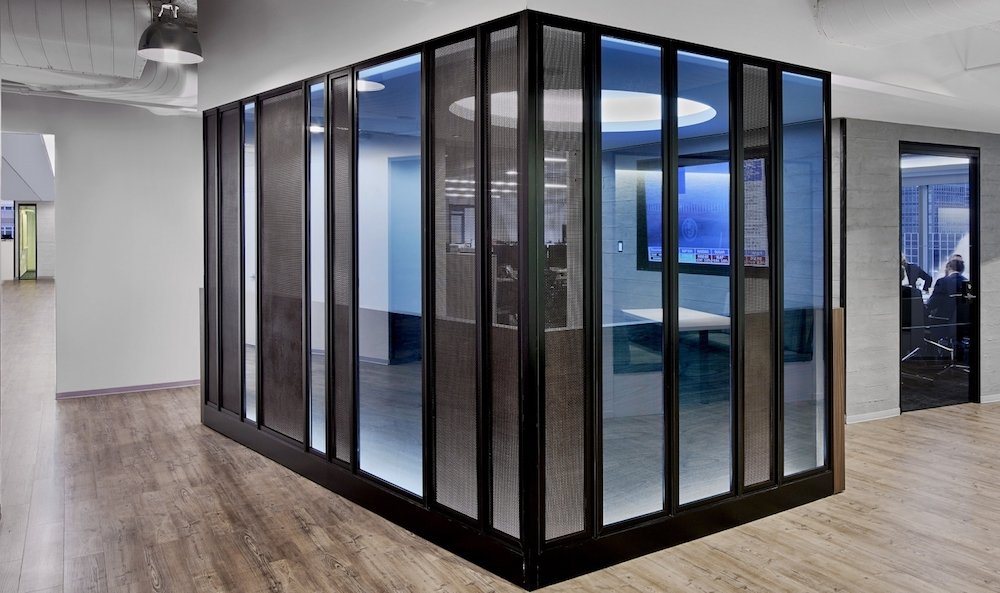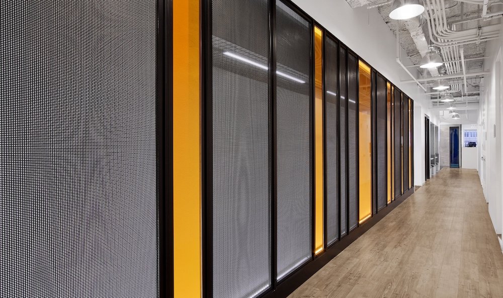 メタルメッシュパネルを使用することによって、パネルの力強さと反映する照明ライトがメタルメッシュパネの存在感をより演出し、プライバシーを一定に保ちながらも空間の視界を狭めることなく、広がりあるエレガントな空間を創造しています。