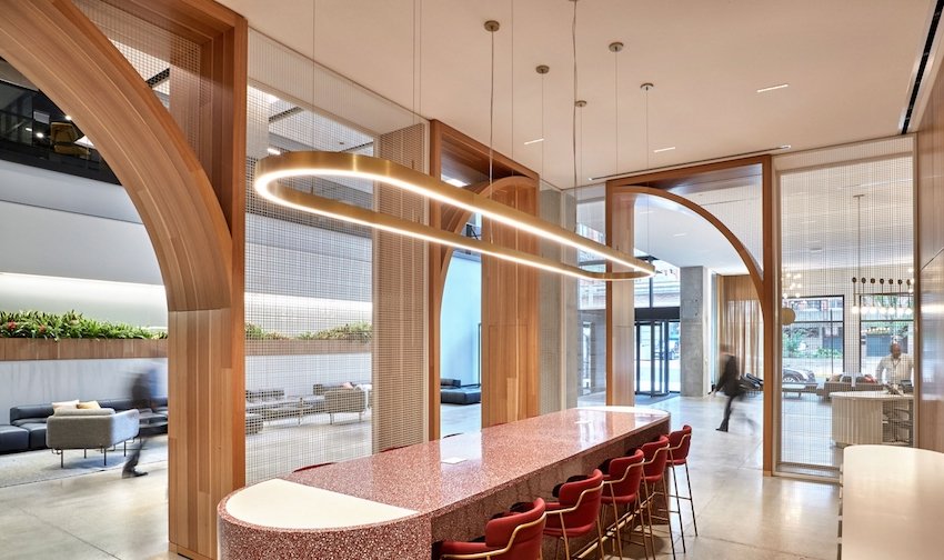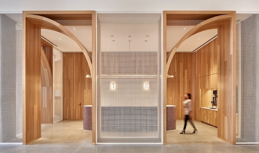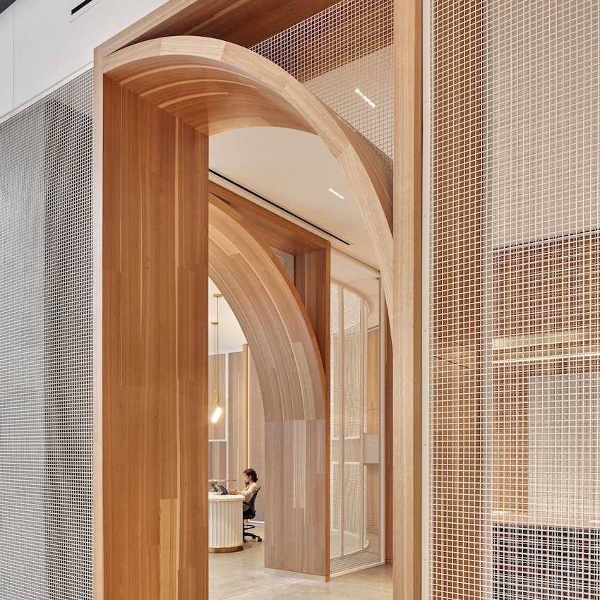 メタルメッシュパネルを使用することによって、パネルの力強さと輝きが空間をエレガントに演出しながら、空間の視界を狭めることなく、広がりある空間を創造してくれるのが魅力的です。