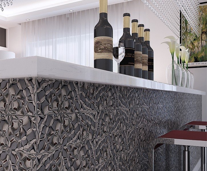 今回使用されているのは装飾タイル「Geom Silver」ですが、Gloss、Matt、Textを使用することによって、表情豊かな壁面を創造しています。