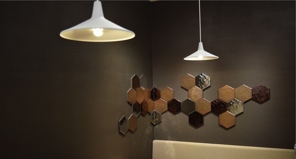 装飾タイル「Shapes」の凹凸あるデザインが照明ライトの光を受け、空間に華やかさとアクセントを加えながら、Bronzoカラーが空間をエレガントに演出しています。