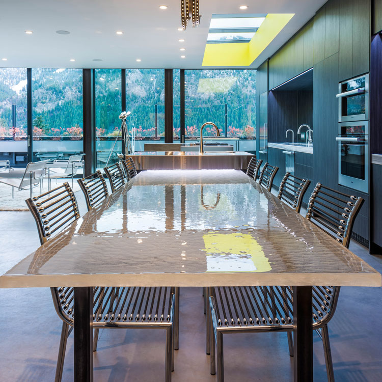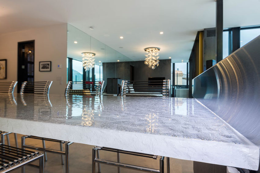 装飾ガラス「ヘビー」をカウンタートップやテーブルトップに使用することで、ガラスが持つ透明感が広がりあるエレガントな空間を演出してくれるだけでなく、独創的かつ高級感溢れる空間を創造します。