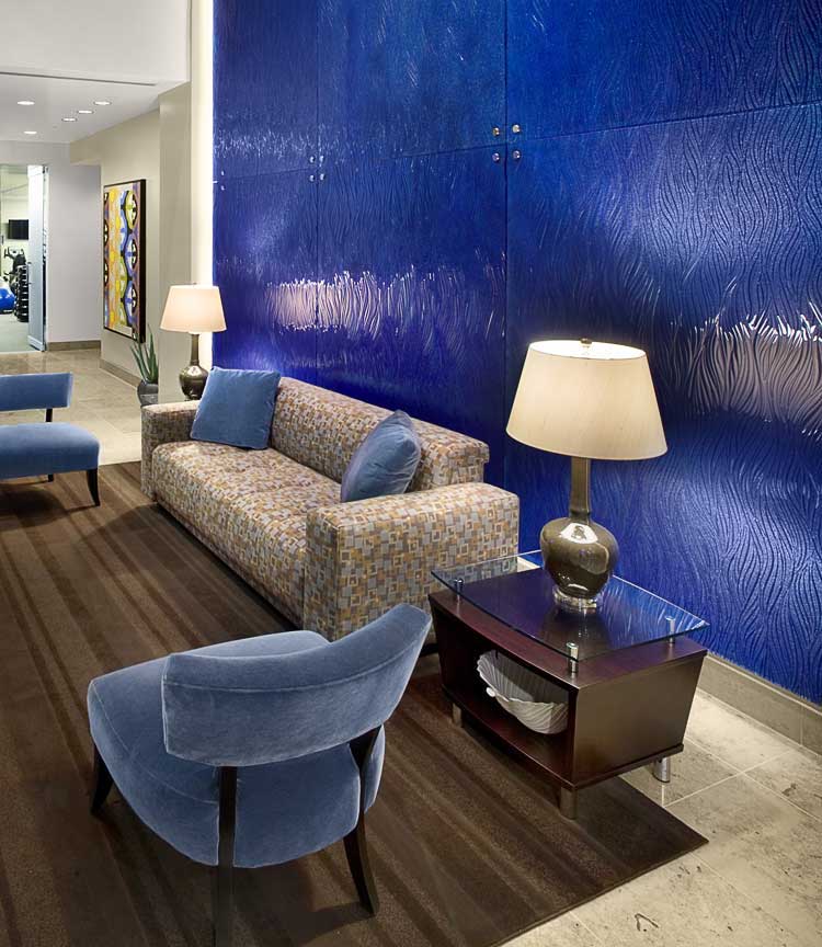 ガラス表面のテクスチャーに照明ライトが反映しながら芸術的な壁面を美しく演出しています。