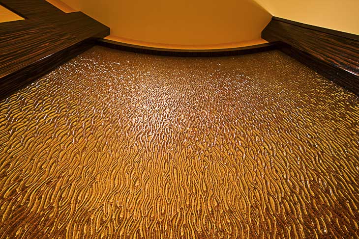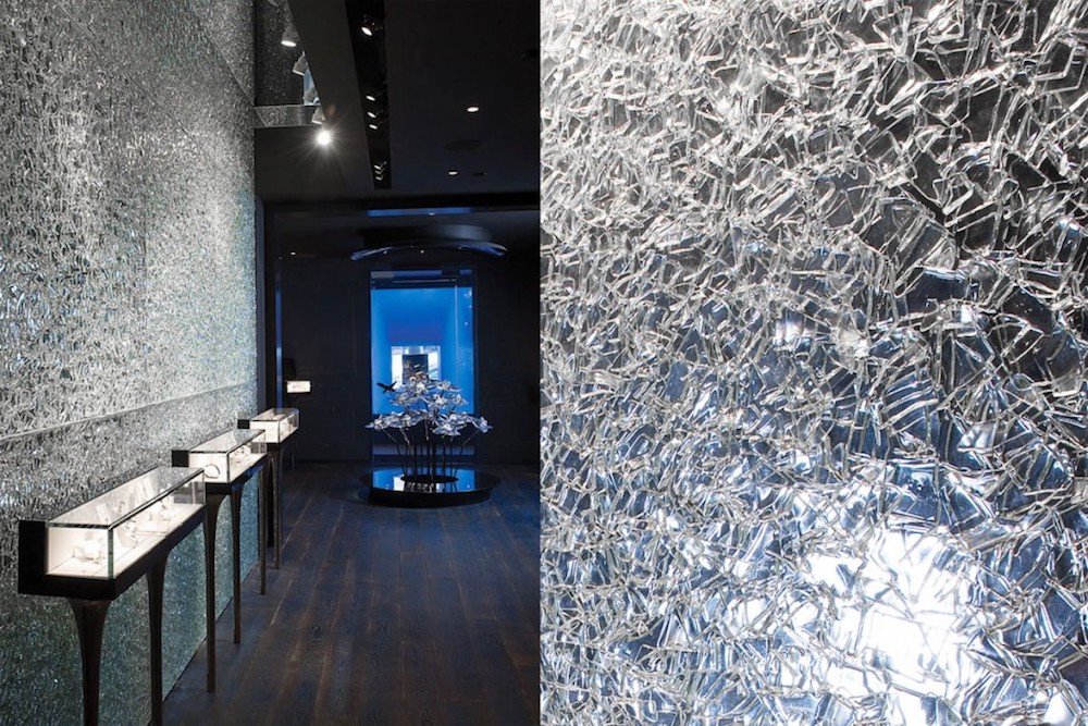 カスタムメイドパターンで製作された装飾ガラスはブランドロゴを反映するように製作され、美しい凹凸か形成され、数百万のクリスタルが施されています。