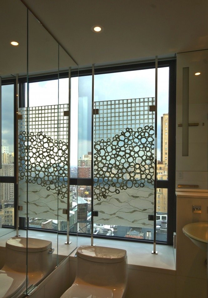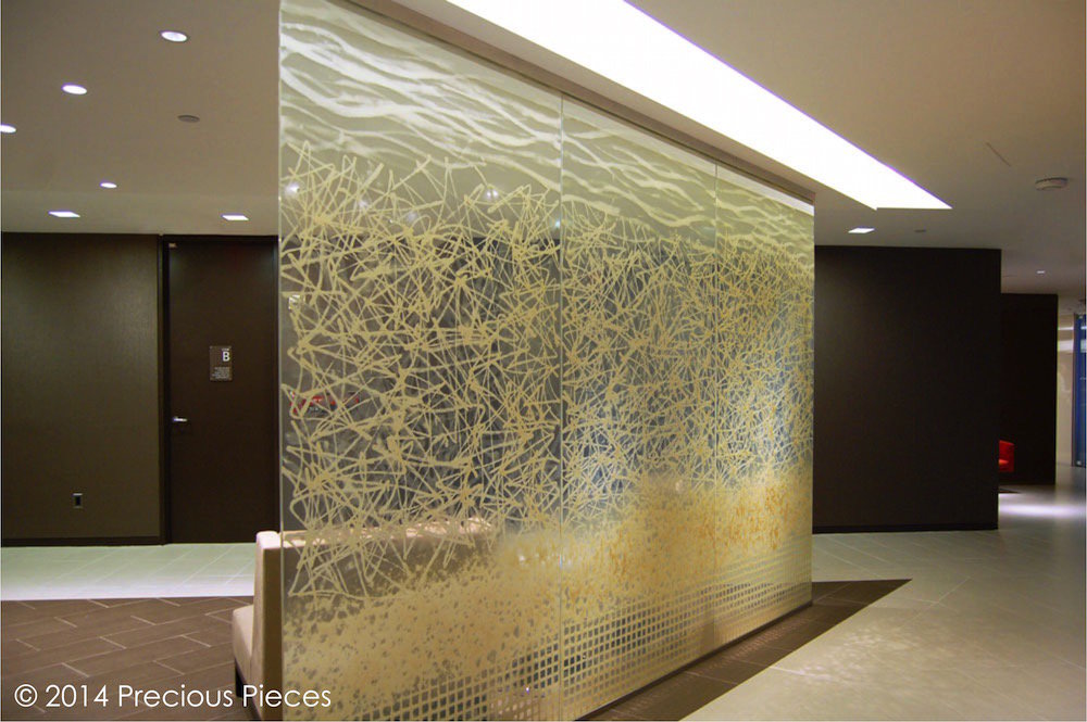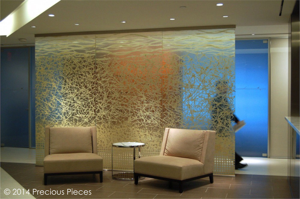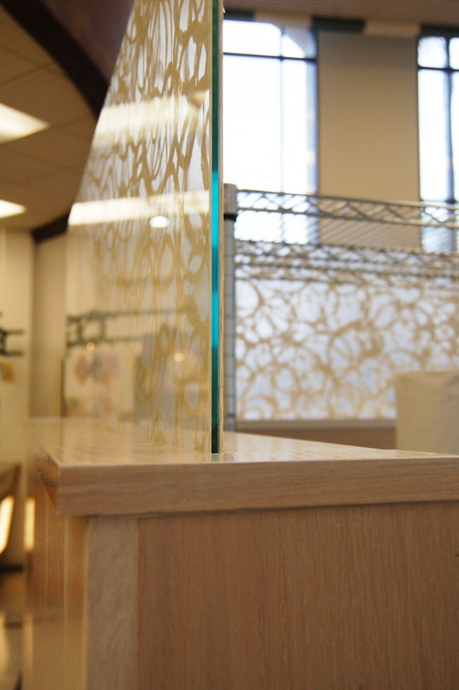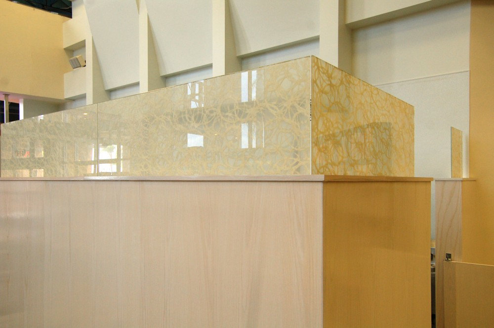 パーテーションとしての役絵だけでなく、照明ライトが装飾ガラスに反射し、美しくエレガントな空間を演出しながら、適度なプライバシーを確保します。